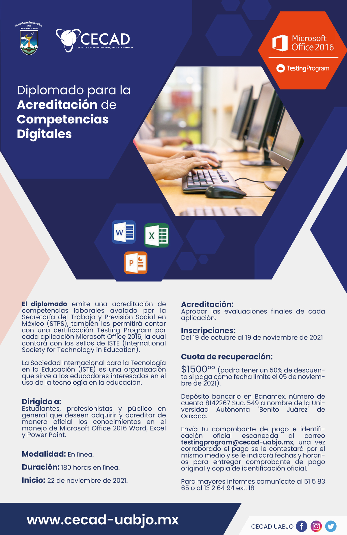 Informes: (951) 51 5 83 65 ext. 18 o escribe a testingprogram@cecad-uabjo.mx